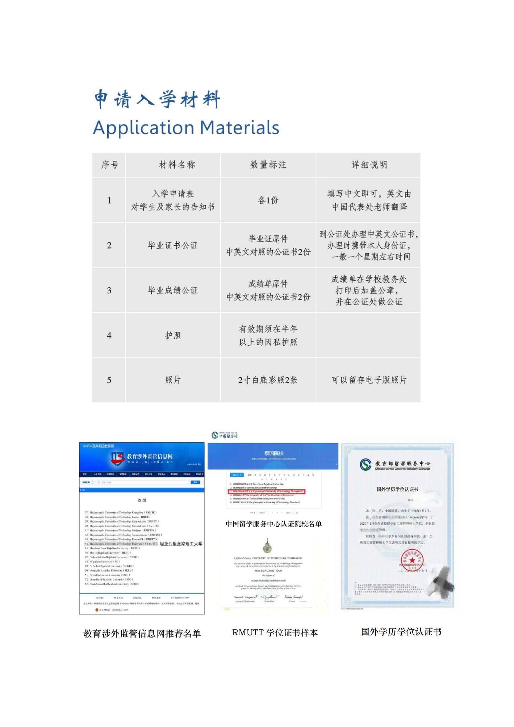 錄取要求:達(dá)到中國各省當(dāng)年本科線的學(xué)生免試入學(xué),未達(dá)到者須參加泰國坦亞武里皇家理工大學(xué)(RMUTT)自主招生選拔考試。