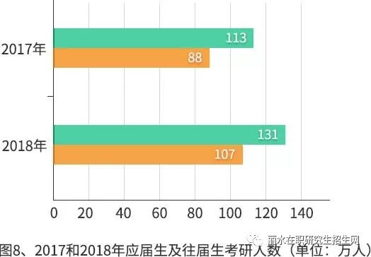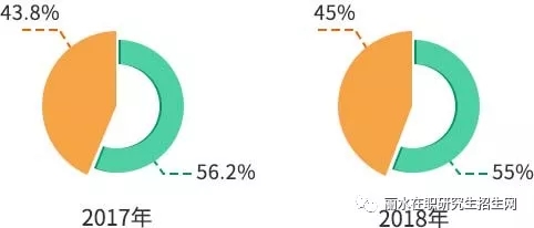 據(jù)教育部統(tǒng)計,2017年共201萬人報考,其中,應(yīng)屆考生113萬人,往屆考生88萬人;2018年共238萬人報考,其中,應(yīng)屆考生131萬人,往屆考生107萬人。從數(shù)據(jù)可知,2017年,往屆生考研人數(shù)占全國報考人數(shù)的43.8%,2018年,往屆生考研人數(shù)占全國報考人數(shù)的45%,同比上升了1.2%。