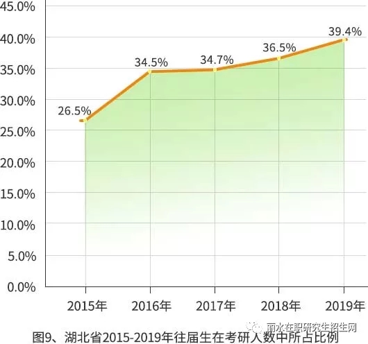 湖北省2015年往屆生所占比例為26.5%,到2019年所占比例升至39.4%: